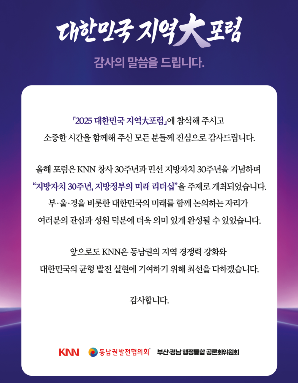 <대한민국 지역大포럼>은 수도권 집중을 완화하고 지역의 미래를 함께 그려가는 공론의 장입니다. 부·울·경이 직면한 핵심 과제를 논의하며, 국가 균형발전을 지향합니다. 부울경 경제블록 구축과 지역 상생을 위한 새로운 성장 해법을 모색합니다.